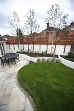 We removed the existing trees to open up the garden to more light. Curves are used throughout in the design to mirror the large curved boundry wall. A new high fence was installed to create privacy while letting light through. A large curved sandstone patio was installed with paths leading of
